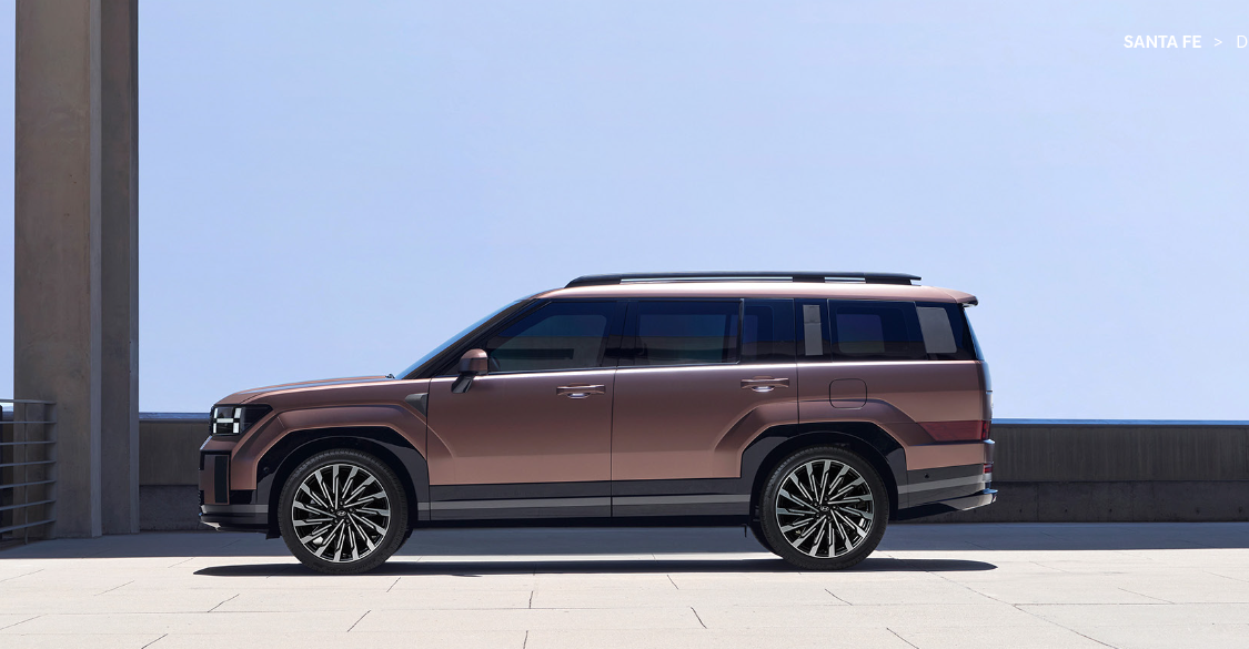 올 뉴 싼타페의 박시한 형태와 차별화된 실루엣은 긴 휠베이스와 넓은 테일게이트 영역에서 비롯되었습니다. 차량의 전면은 높은 후드와 H자형 헤드램프, 대담하고 날카로운 펜더로 웅장함을 자아냅니다. H자형 헤드램프는 H모티프 전면 하부 디자인과 조화를 이루며 시각적 완성도를 높였습니다.